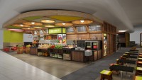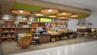 Striking harvest style kiosk with rustic timbers, fresh produce and quick service product lines. This kiosk will serve healthy food for the traveller who needs a refreshing snack or meal before taking off.