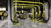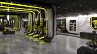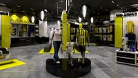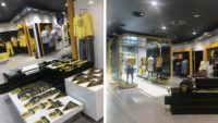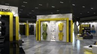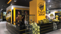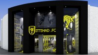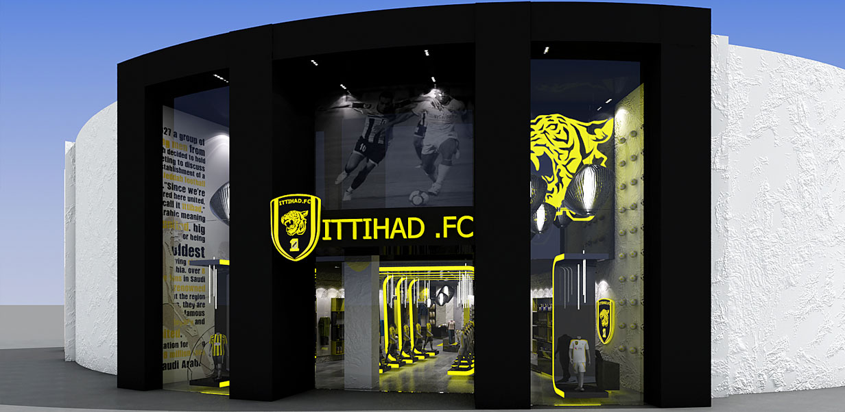 Ittihad football clubs flagship store in Jeddah. Strong brand elements encompassing the logo and colour ways. A striking entrance walkway was designed to bring clients into the store.