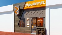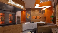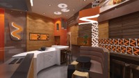 Riyadh, Saudi Arabia. A striking design with forms derived from the logo and shape of the Shawarma this rustic and contemporary design takes the art of kebabs to a different level. Strong colours and wallpapers are in contrast to the rustic timbers in the joinery and walls.